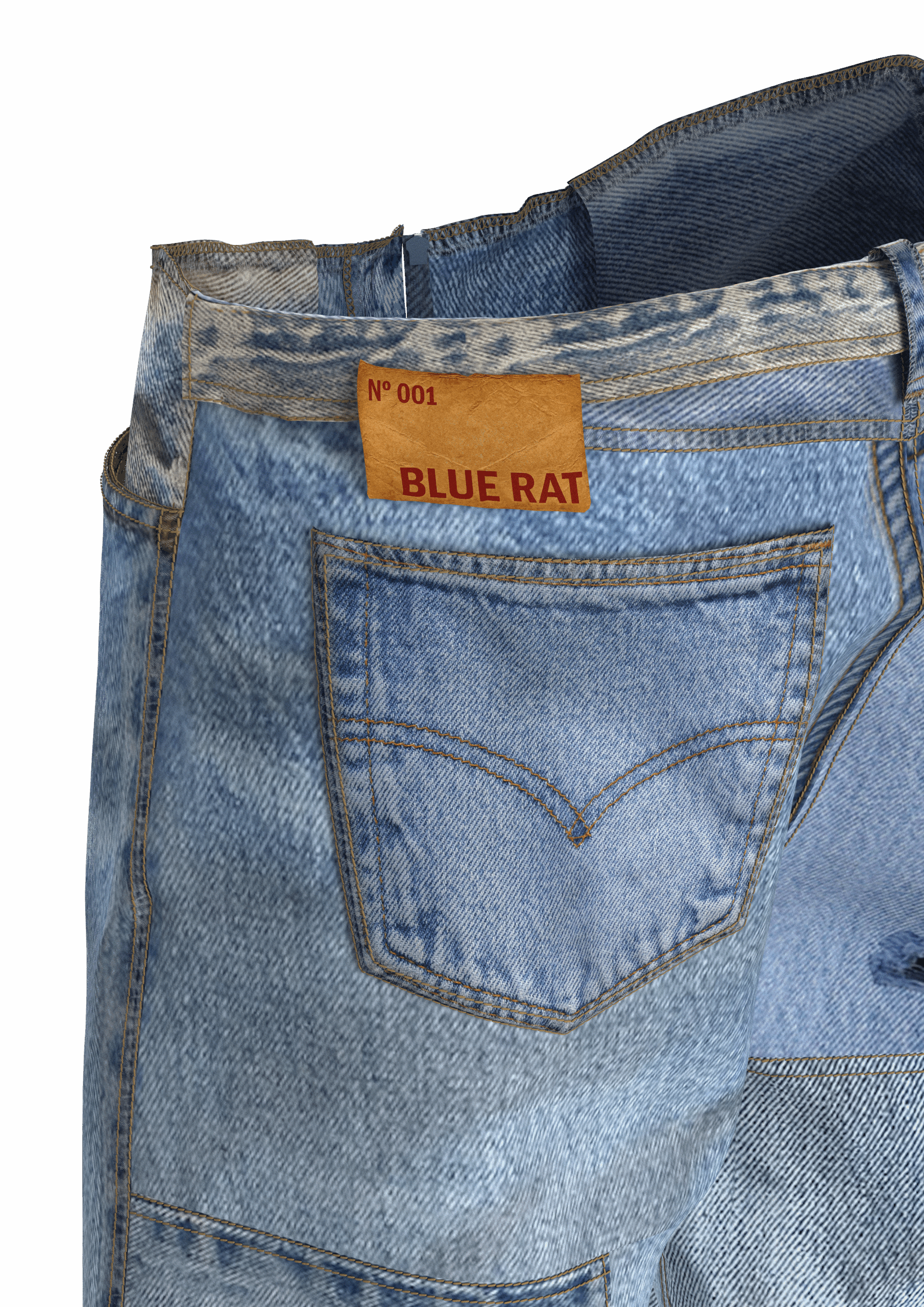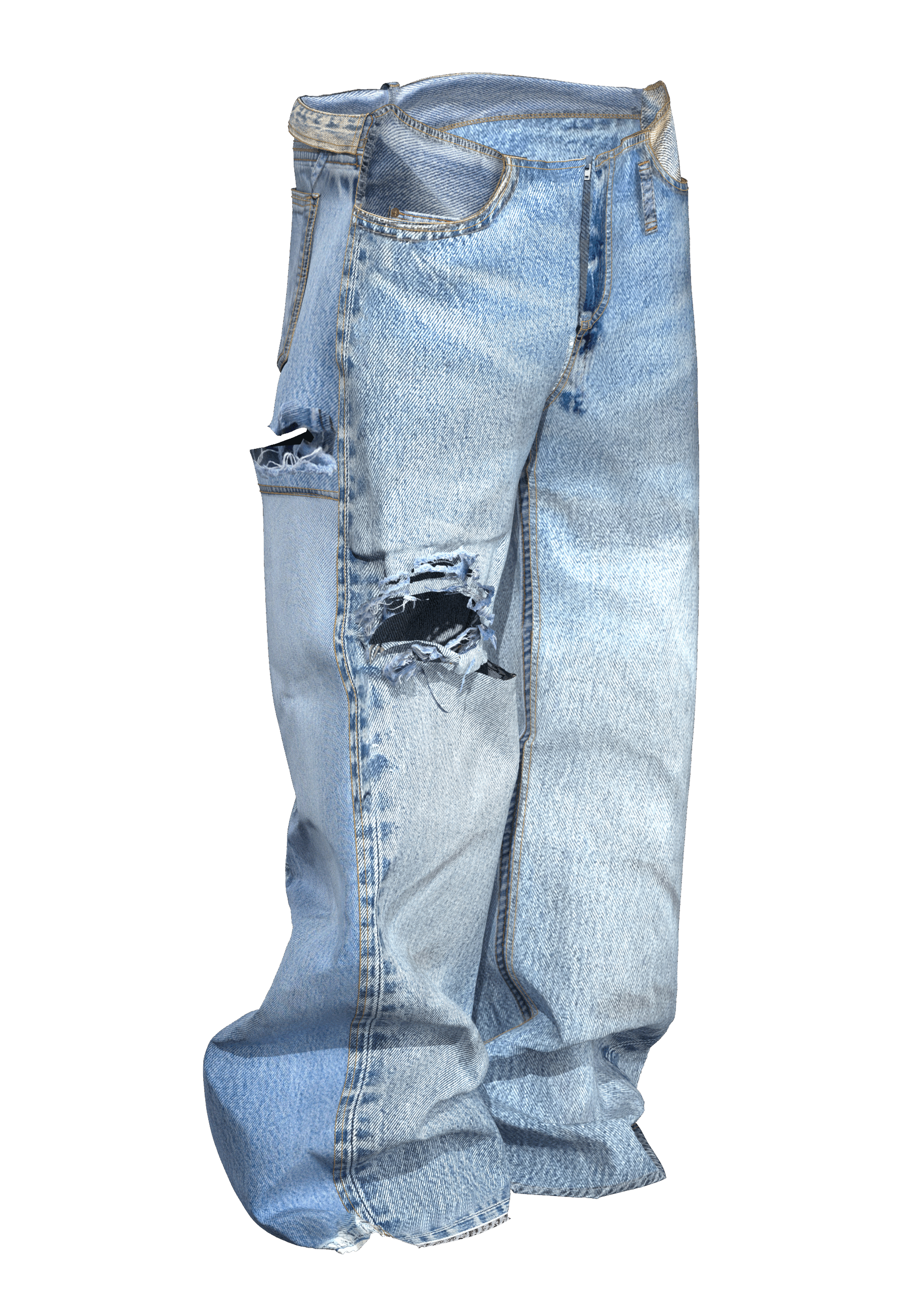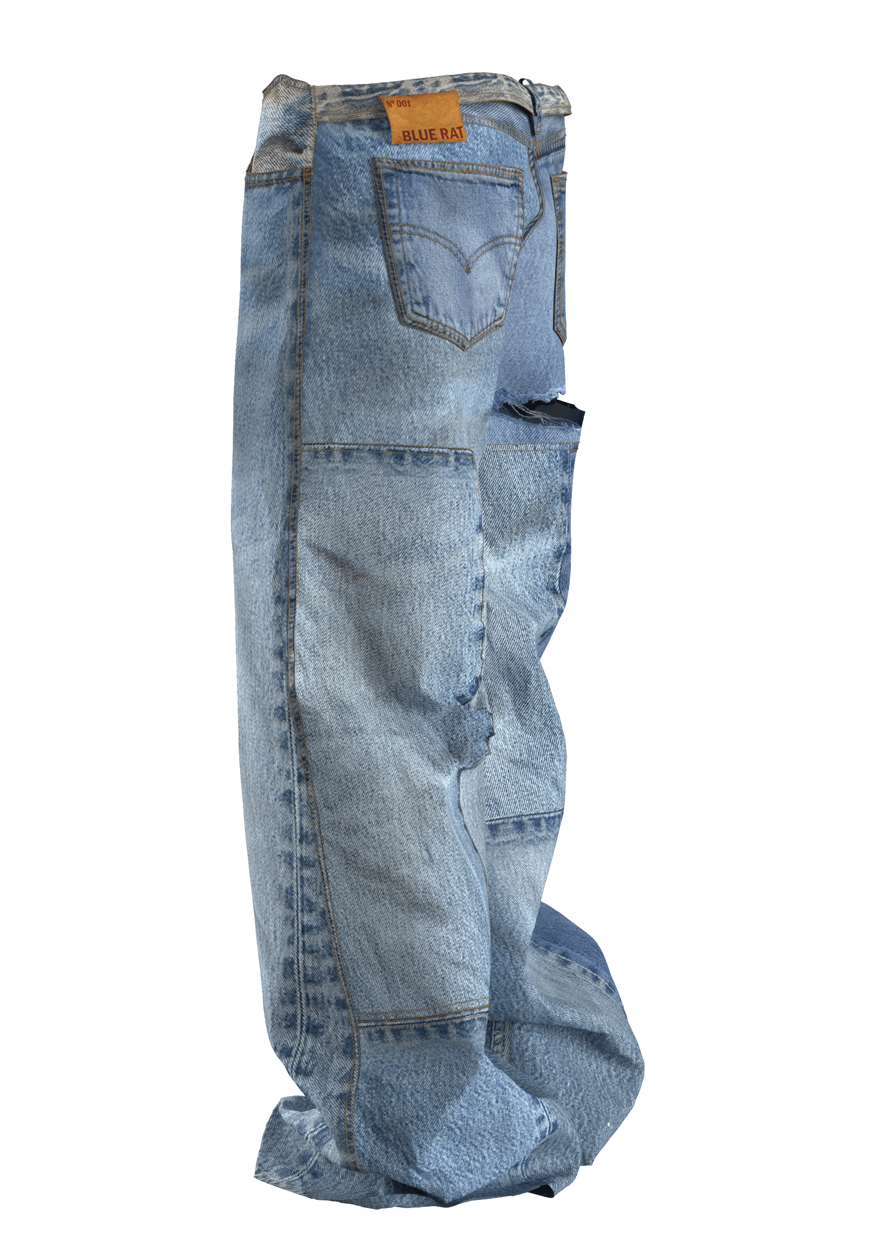 Diseñado a partir de retales reales y texturas escaneadas, este pantalón fusiona denim vintage de distintas tonalidades con un fit oversized y una cintura super low rise.